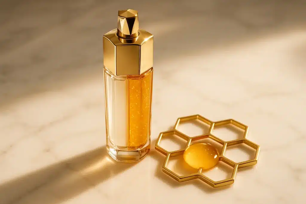 Le flacon doré est très élégant. À la première utilisation, j’ai pressé la pompe. Deux formules se mélangent en une gelée dorée. La texture est légère, sans gras. Le parfum de miel est délicat, pas trop fort. Une petite quantité suffit.