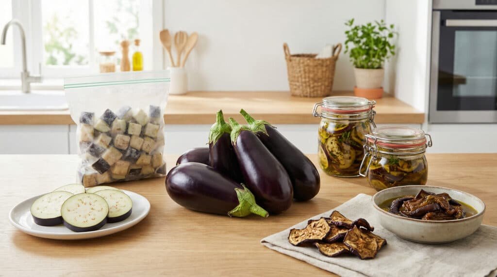 La conservation de l’aubergine s’adapte à la durée de stockage visée. Si la température ambiante privilégie la qualité immédiate, le réfrigérateur offre un léger sursis. Pour le long terme, la congélation après blanchiment, la déshydratation et les conserves à l’huile constituent des techniques fiables pour préserver ce légume sensible.