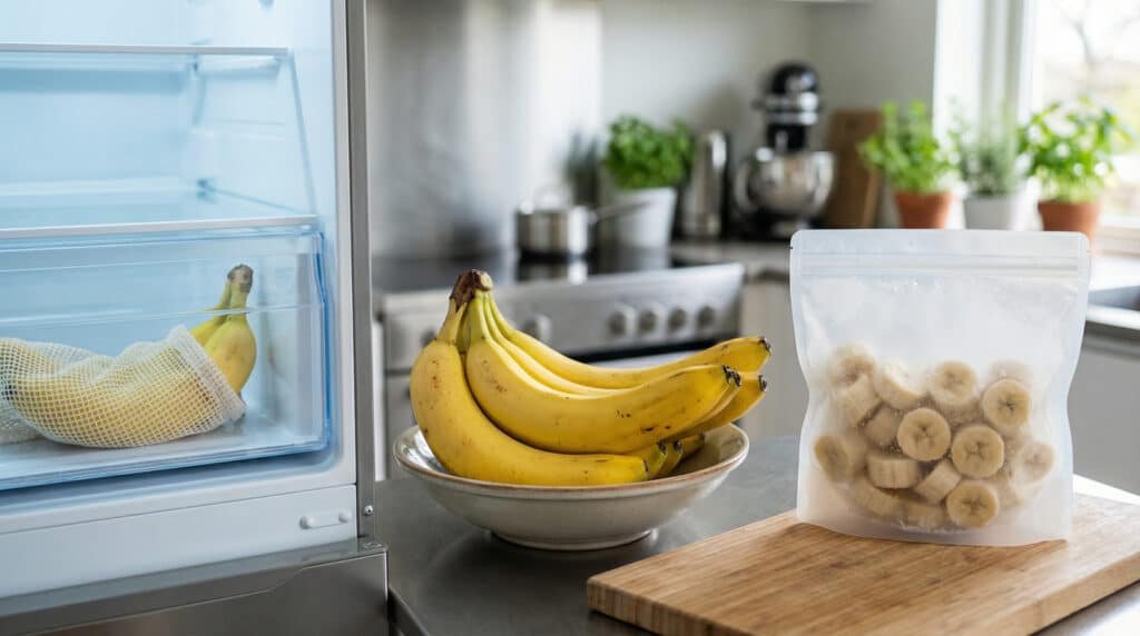 La réfrigération des bananes mûres ralentit leur maturation interne de manière significative ; la chair reste fraîche et ferme jusqu’à deux semaines, malgré le noircissement de la peau.