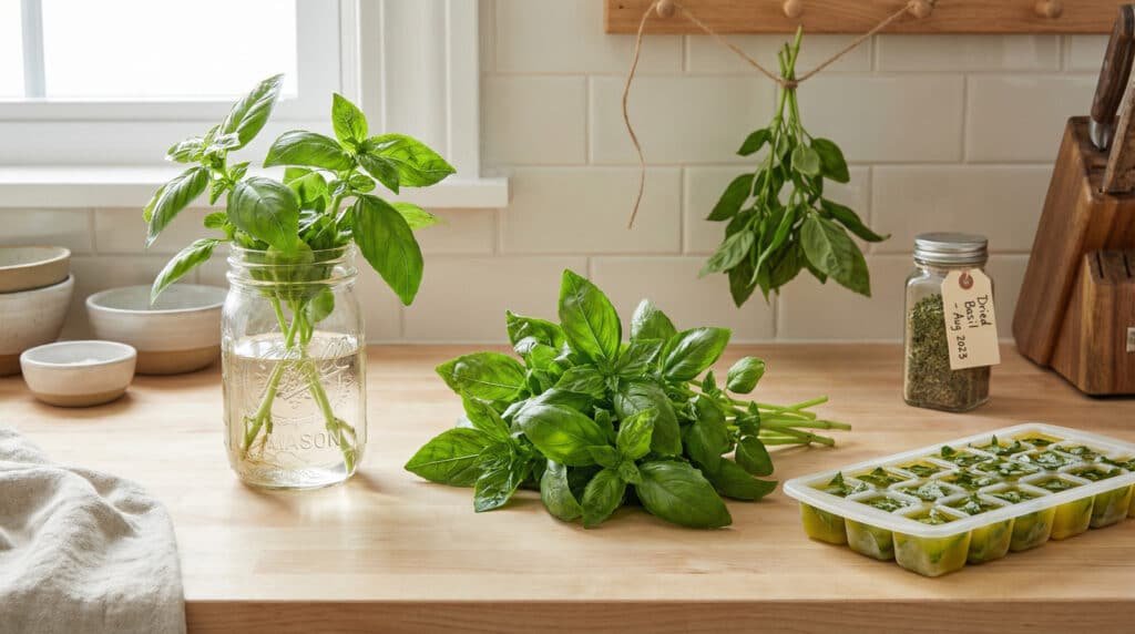 Le choix de la méthode de conservation du basilic dépend de l’usage et de la durée visés. La technique du bouquet dans l’eau offre la meilleure fraîcheur à court terme, surpassant le réfrigérateur. Pour une conservation durable, la congélation préserve davantage les arômes que le séchage, tandis que la culture en pot garantit un approvisionnement constant.
