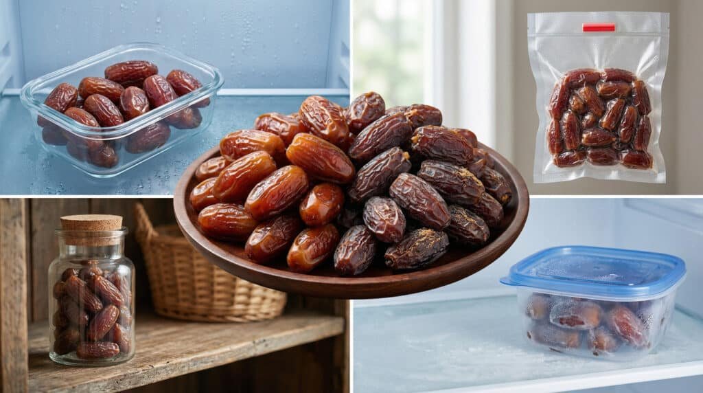 Le réfrigérateur est l’option reine pour les dattes fraîches et molles, type Medjool. Le froid bloque le dessèchement et préserve cette texture humide si particulière.