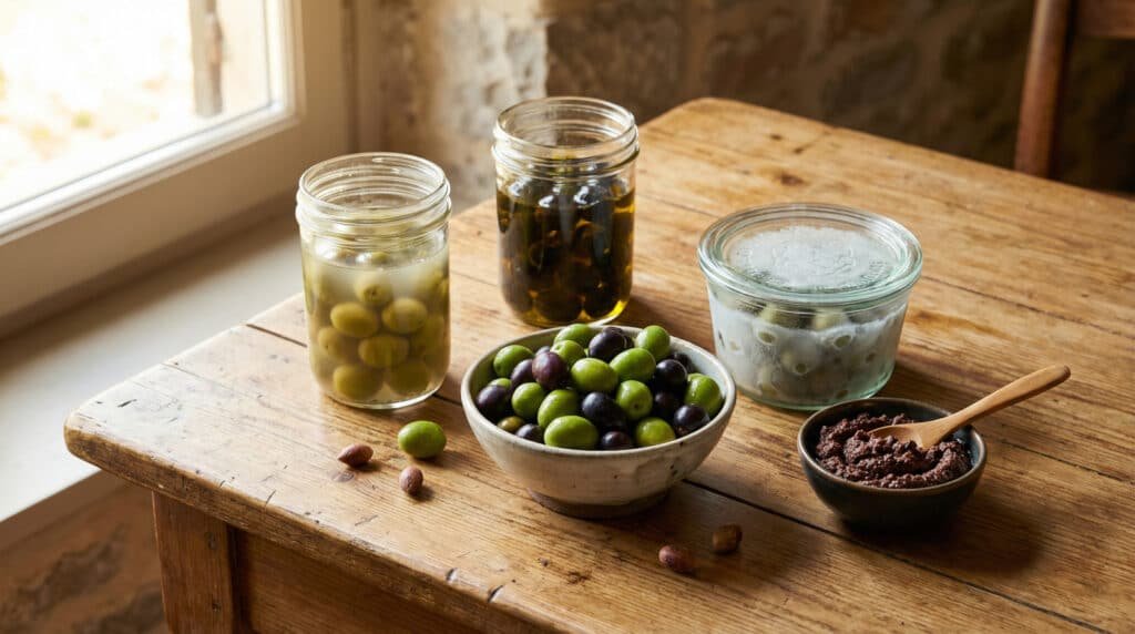 Une fois l’amertume retirée, la conservation repose souvent sur des liquides protecteurs comme la saumure ou l’huile.