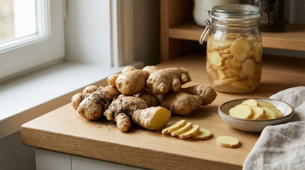 Une alternative durable sans réfrigération consiste à immerger le gingembre pelé dans un bocal rempli d’alcool fort (comme de la vodka) ou de vinaigre pour une version marinée. Le séchage, par déshydratation des tranches pour en faire de la poudre, permet également une conservation de plus d’un an dans un placard.
