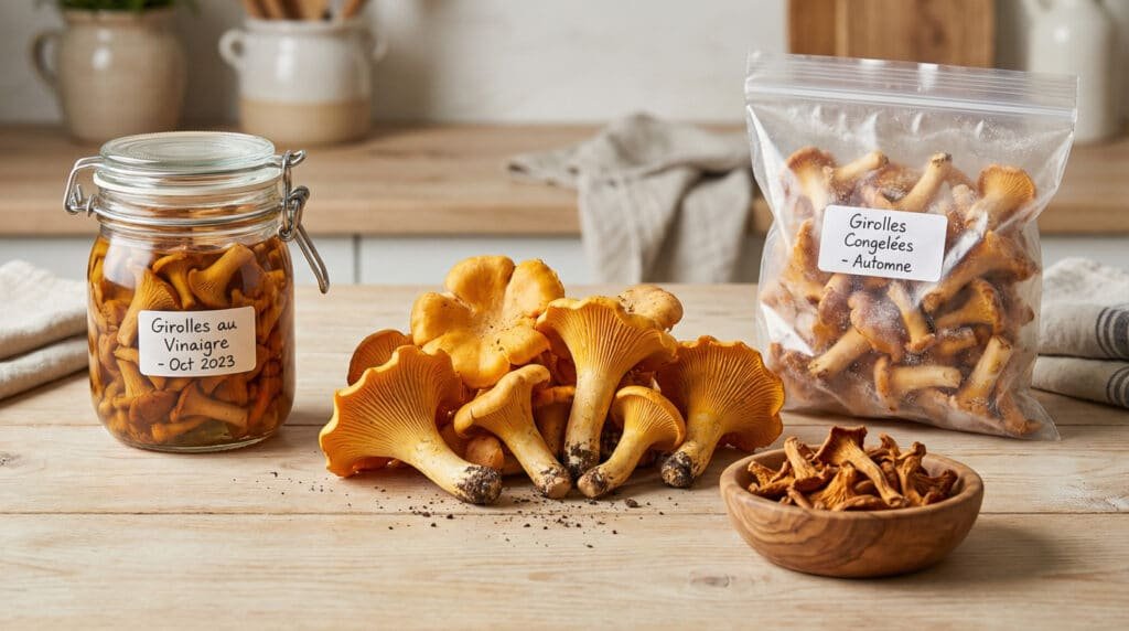 Plusieurs techniques permettent de préserver les girolles selon la durée de conservation souhaitée. Pour une consommation rapide sous 2 à 5 jours, la réfrigération dans un bac à légumes, à l’intérieur d’un sac en papier, est idéale. Pour une conservation à long terme, la congélation (après cuisson préalable), le séchage au four ou au déshydrateur, ainsi que la mise en bocal (à l’huile ou au vinaigre) constituent des solutions efficaces permettant de garder les champignons plusieurs mois, voire plusieurs années.