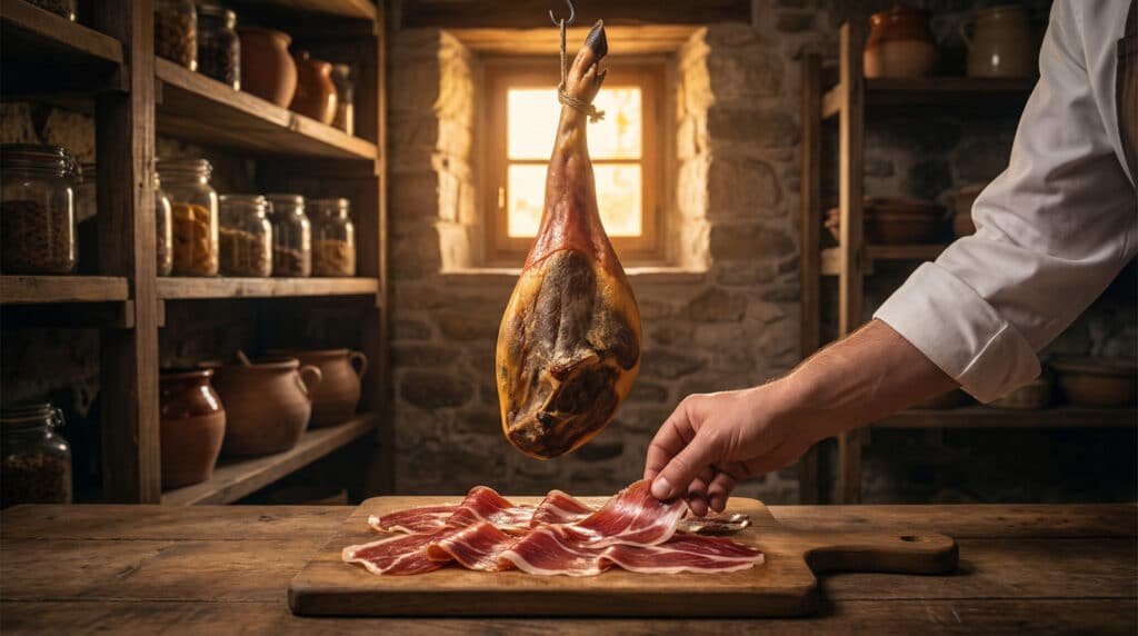 La méthode de suspension est stricte. Le jambon doit être suspendu à la verticale par la patte. Cette position force les graisses à s’infiltrer uniformément dans les fibres de la viande, garantissant une texture fondante.