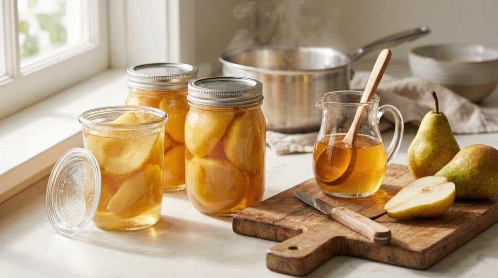 L’essentiel à retenir : la réussite des conserves de poires repose sur l’immersion immédiate des fruits dans l’eau citronnée contre l’oxydation et le choix d’un sirop adapté. Une stérilisation rigoureuse de 45 minutes à 100°C reste indispensable pour détruire les micro-organismes, garantissant ainsi une conservation sécurisée de la saveur et de la texture jusqu’à 12 mois.