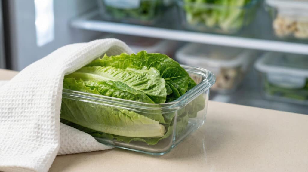 La méthode la plus courante reste simple et accessible. Placez vos feuilles dans une grande boîte hermétique en plastique ou en verre. Ne tassez surtout pas la salade à l’intérieur. L’air doit pouvoir circuler librement pour éviter la pourriture rapide.