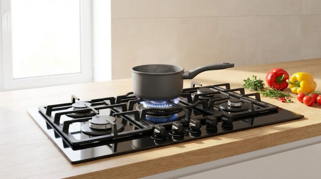 Ce qui rassure immédiatement, c’est la présence de la sécurité par thermocouple sur chaque foyer. Si un courant d’air ou un débordement éteint la flamme, le système coupe l’arrivée de gaz en quelques secondes. C’est mécanique et infaillible.