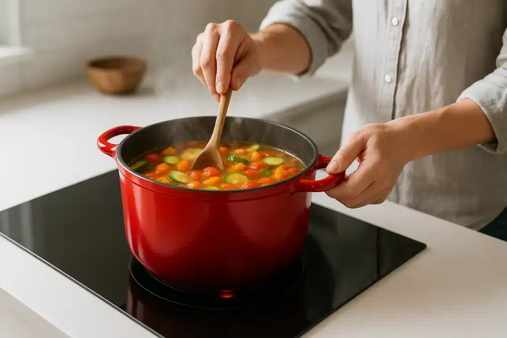 J’ai testé cette cocotte sur induction avec un bouillon de légumes. La montée en température est lente, mais une fois chaude, la chaleur se stabilise exceptionnellement. Pour un bœuf bourguignon, trois heures de cuisson ont donné viande fondante et légumes savoureux. Une fois la température idéale atteinte, plus besoin de surveiller : le couvercle hermétique retient l’humidité, les parois évitent les brûlures.